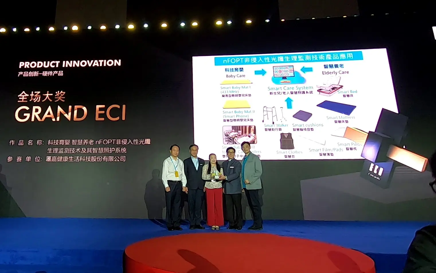 滙嘉健康獲獎的創新技術「非侵入性光纖生理監測技術及智慧照護系統」(Non-invasive Fiber Optic Physiological Monitoring Technology (nFOPT) and Smart Care System) 採用光纖全反射原理每次動作無電磁場變化 (無電磁波),為高敏感度高精準度的生理感應器,可實現監測生理活動如呼吸、心率、血壓、睡眠分析、活動狀態等變化。