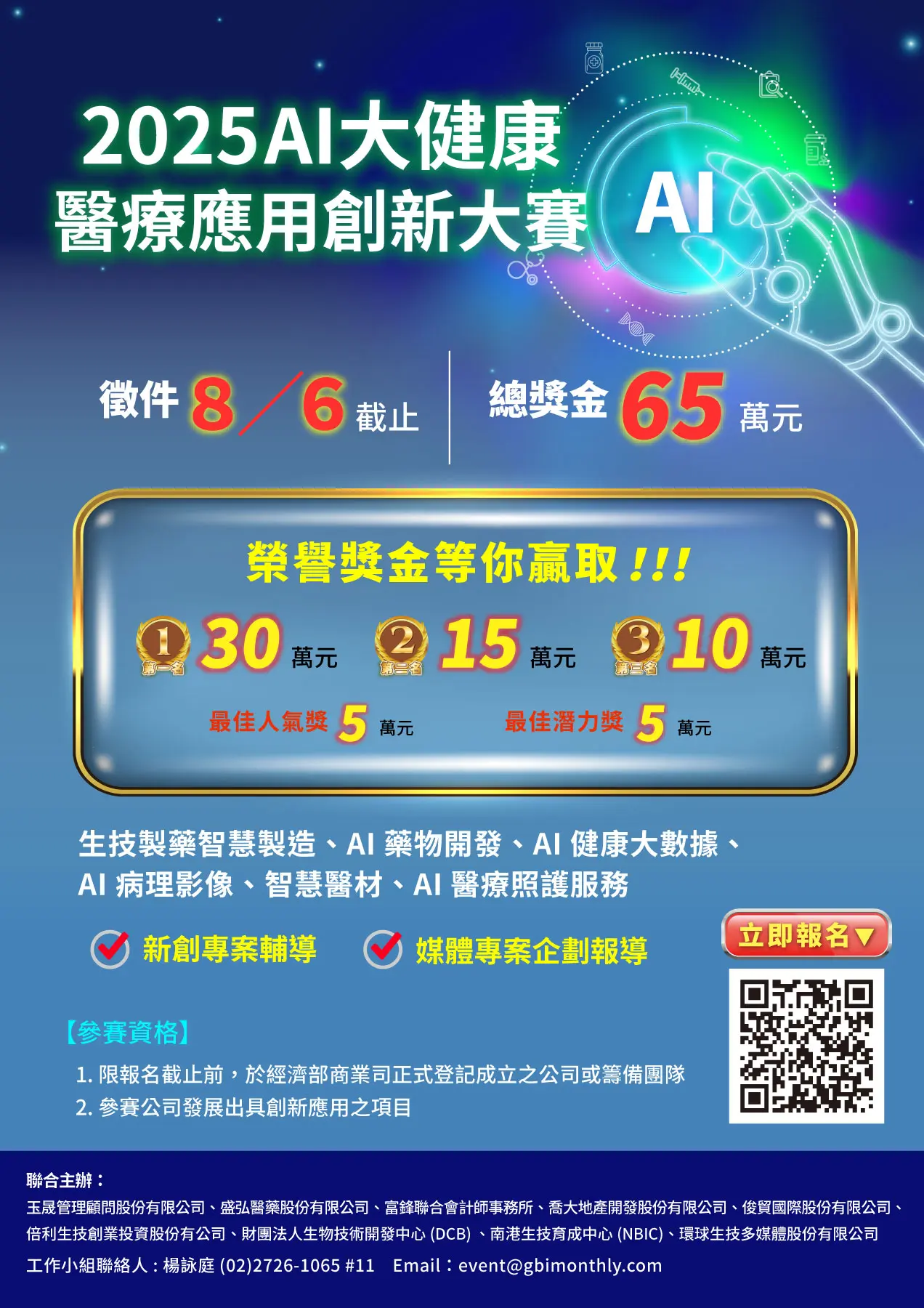 本次由玉晟管理顧問股份有限公司、盛弘醫藥股份有限公司、富鋒聯合會計師事務所、喬大地產開發股份有限公司、俊貿國際股份有限公司、倍利生技創業投資股份有公司、財團法人生物技術開發中心(DCB)南港生技育成中心(NBIC)、環球生技多媒股份有限公司聯合主辦,希望透過本次競賽,培養更多具全球競爭力的AI健康科技團隊,推動台灣成為數位健康創新的重鎮,比賽報名費用為20,000元整。報名截止日期為8月6日前,需至活動官方網站完成報名程序。更多詳情與報名資訊請洽詢活動官方網站(https://news.gbimonthly.com/tw/activity/show.php?num=1657)。